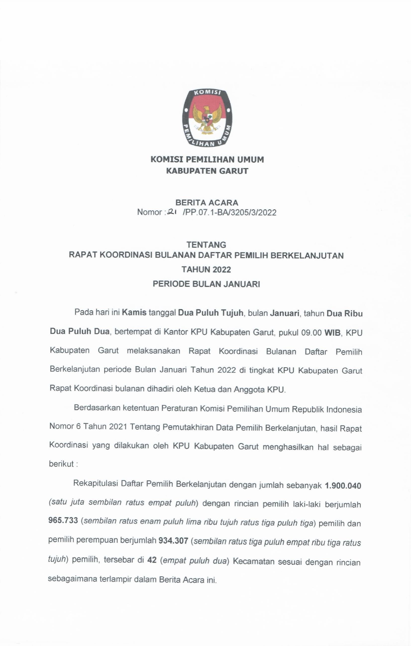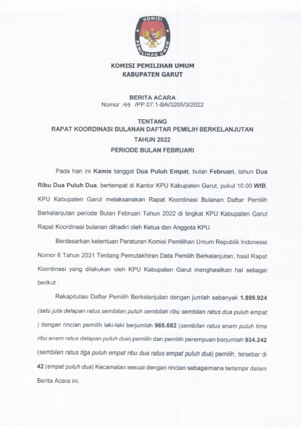 Berdasarkan ketentuan Peraturan Komisi Pemilihan Umum Republik Indonesia Nomor 6 Tahun 2021 Tentang Pemutakhiran Data Pemilih Berkelanjutan, hasil Rapat Koordinasi yang dilakukan oleh KPU Kabupaten Garut menghasilkan hal sebagai berikut :