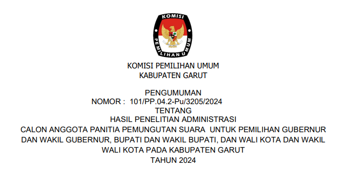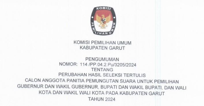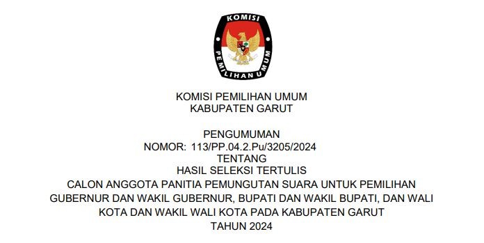 KPU Kabupaten Garut telah melaksanakan tahapan Wawancara dan menyelesaikan seluruh tahapan seleksi Calon Anggota Panitia Pemilihan Kecamatan pada untuk Pemilihan Gubernur dan Wakil Gubernur, Bupati dan Wakil Bupati, Tahun 2024, disampaikan beberapa hal sebagai berikut: selengkapnya DI UNDUH DISINI