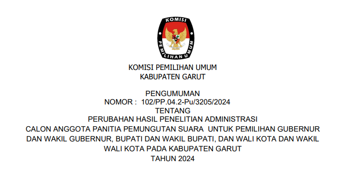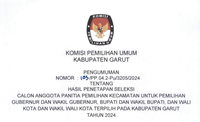 Sehubungan dengan hal tersebut di atas, KPU Kabupaten Garut mengundang calon anggota Panitia Pemilihan Kecamatan terpilih untuk hadir dalam pelantikan, pengambilan sumpah/janji, dan penandatanganan pakta integritas anggota Panitia Pemilihan Kecamatan pada Hari Kamis Tanggal 16 Mei 2024 bertempat di Hotel Harmoni Garut, Jl. Cipanas Baru No.7 Tarogong Kaler