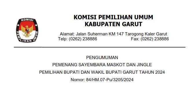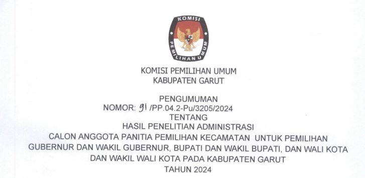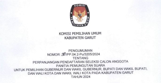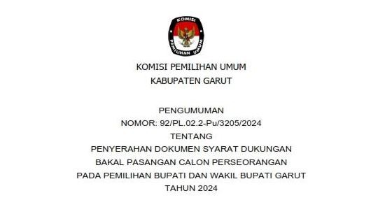 Berdasarkan Peraturan Komisi Pemilihan Umum Nomor 2 Tahun 2024 tentang Tahapan dan Jadwal Pemilihan Gubernur dan Wakil Gubernur, Bupati dan Wakil Bupati serta Walikota dan Wakil Walikota, KPU Kabupaten Garut mengumumkan jadwal Penyerahan Dokumen Syarat Dukungan Bakal Pasangan Calon Perseorangan pada Pemilihan Bupati dan Wakil Bupati Garut Tahun 2024.