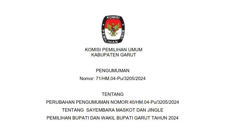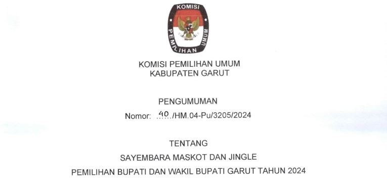 Berdasarkan Peraturan Komisi Pemilihan Umum Nomor 2 Tahun 2024 tentang Tahapan dan Jadwal Pemilihan Gubernur dan Wakil Gubernur, Bupati dan Wakil Bupati, serta Walikota dan Wakil Walikota Tahun 2024, dengan ini Komisi Pemilihan Umum Kabupaten Garut mengadakan Sayembara Maskot dan Jingle Pemilihan Bupati dan Wakil Bupati Garut Tahun 2024 dengan ketentuan sebagai berikut: