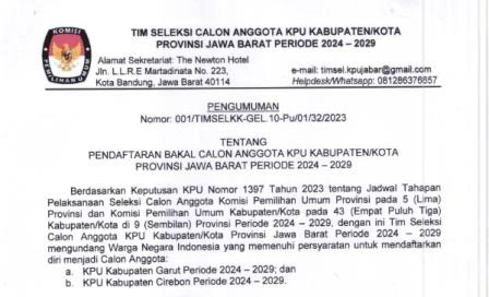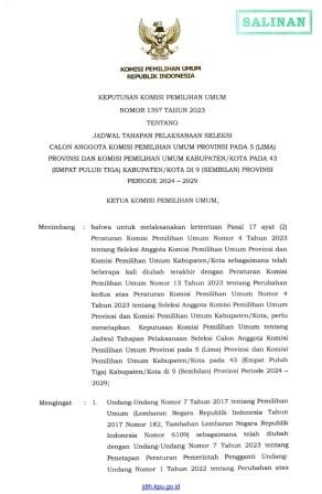 Berdasarkan Keputusan KPU Nomor 1397 Tahun 2023 tentang Jadwal Tahapan Pelaksanaan Seleksi Calon Anggota Komisi Pemilihan Umum Provinsi pada 5 (Lima) Provinsi dan Komisi Pemilihan Umum Kabupaten/Kota pada 43 (Empat Puluh Tiga) Kabupaten/Kota di 9 (sembilan) Provinsi Periode 2024 - 2029,